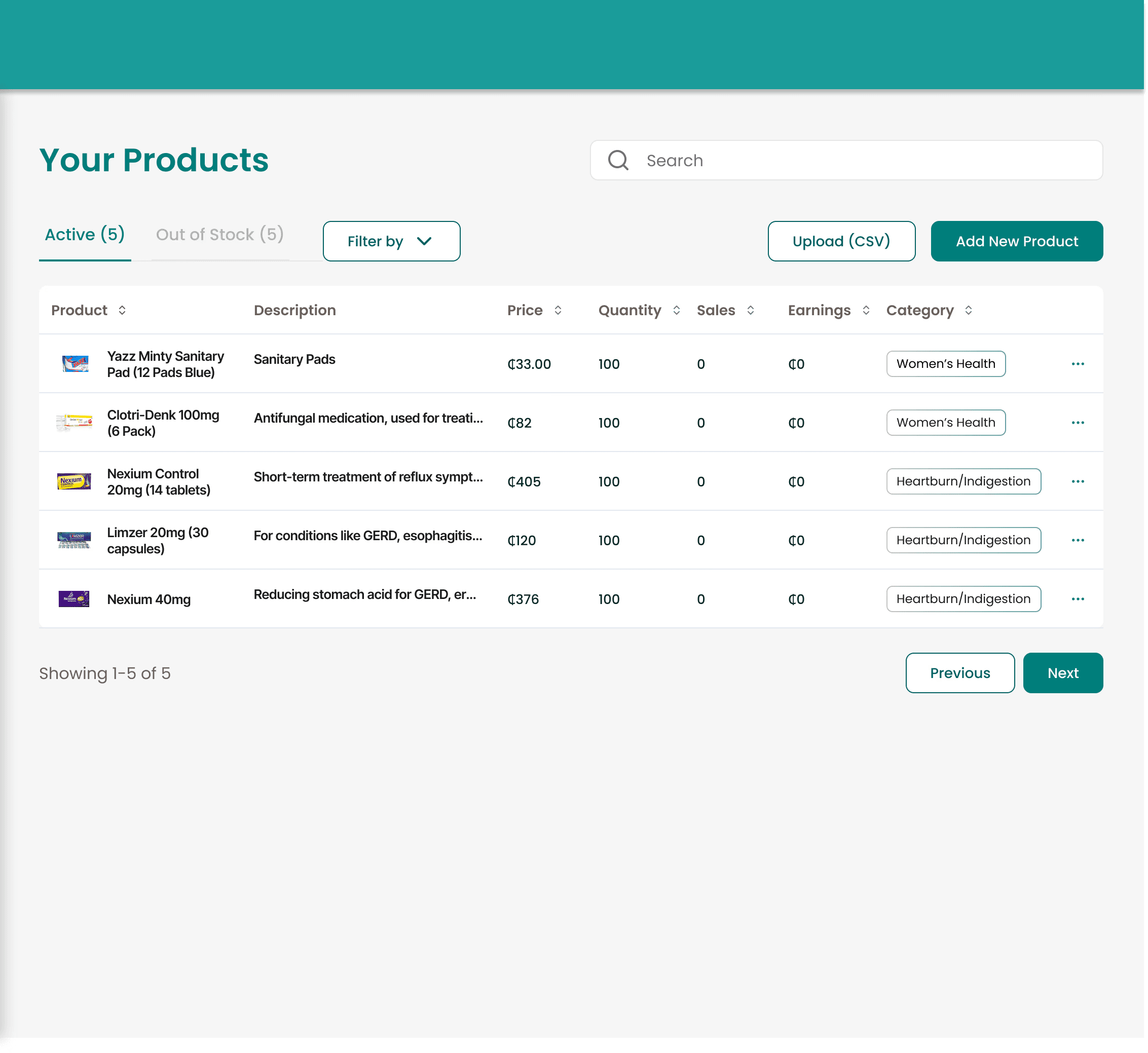 Product Management — Upload medicines with name, description, price, stock